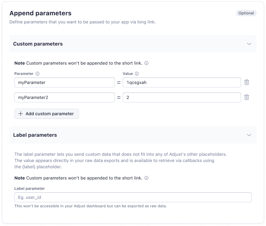 Custom parameters are key-value pairs you add during link creation. Adjust includes them in the long link (full click URL).