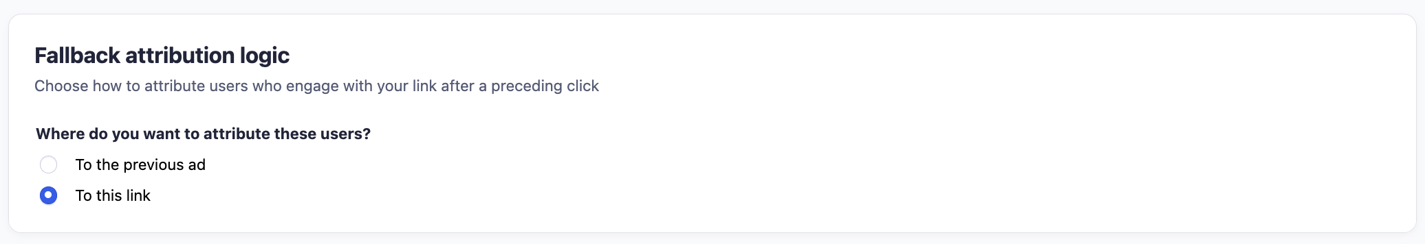 Under Fallback Attribution Logic, choose how to attribute users who engage with an ad before clicking this deep link. Choose from the following two options